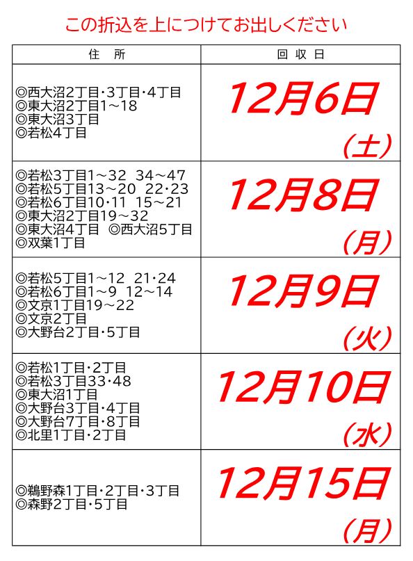 • お住いのご住所ごとに、回収日が異なりますのでご確認のうえ
