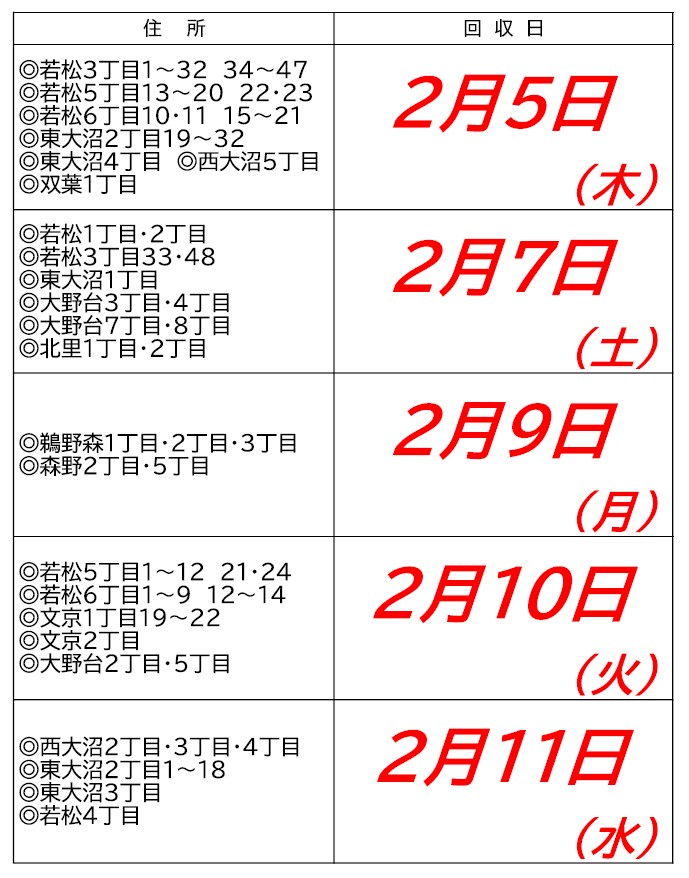 - お住いのご住所ごとに、回収日が異なりますのでご確認のうえ