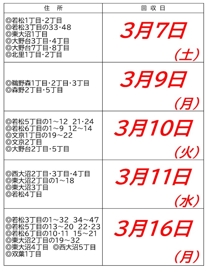 • お住いのご住所ごとに、回収日が異なりますのでご確認のうえ