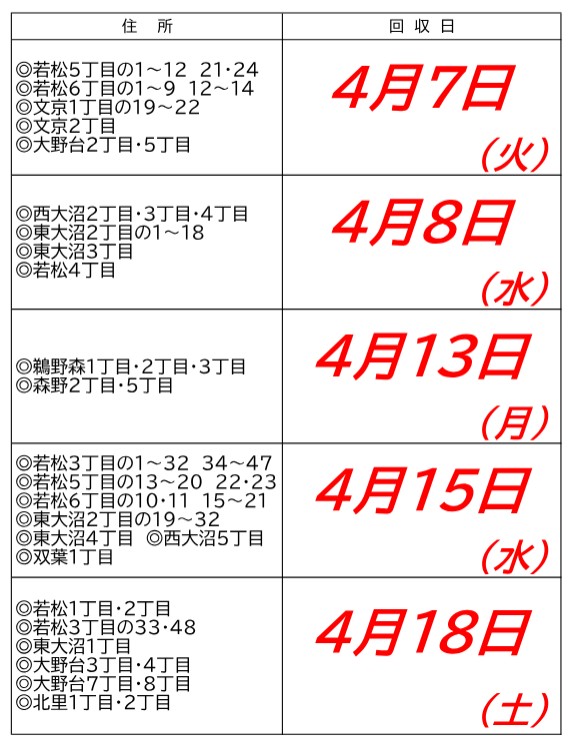 - お住いのご住所ごとに、回収日が異なりますのでご確認のうえ
