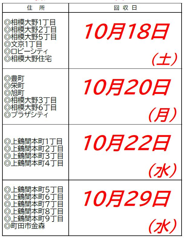 • お住いのご住所ごとに、回収日が異なりますのでご確認のうえ