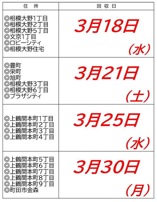 • お住いのご住所ごとに、回収日が異なりますのでご確認のうえ