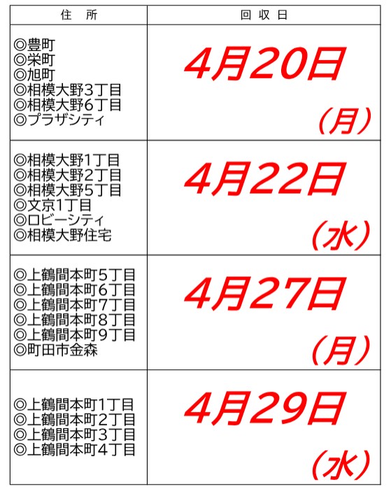 • お住いのご住所ごとに、回収日が異なりますのでご確認のうえ